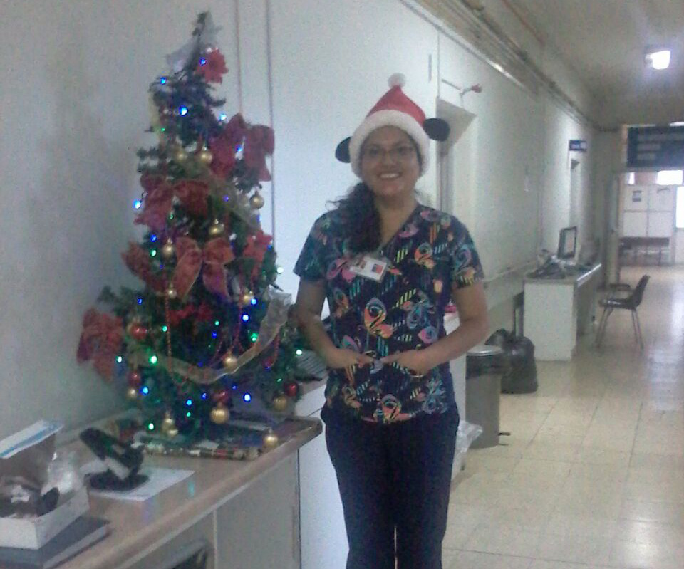 Para Evita Riquelme, enfermera hace 5 años, esta Navidad en el Hospital El Pino de San Bernardo fue la primera que vivió lejos de su familia. “Es la primera vez que me toca pasar una navidad en mi trabajo, que a su vez es mi segundo hogar.