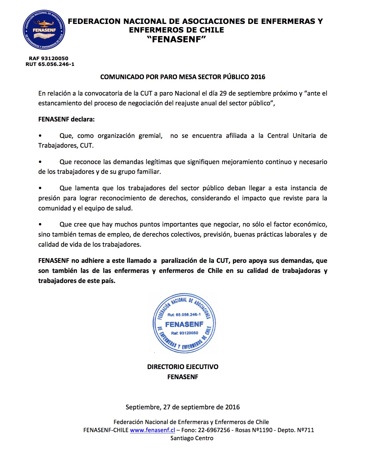 FENASENF no adhiere a este llamado a paralización de la CUT, pero apoya sus demandas, que son también las de las enfermeras y enfermeros de Chile en su calidad de trabajadoras y trabajadores de este país.