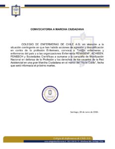Conglomerado de Enfermería de Chile anuncia movilización y convoca a una Marcha Ciudadana 28 de Junio de 20189 de Octubre de 2018 FENASENF Noticias, Noticias FENASENF, Slides El Conglomerado de Enfermería formado por el Colegio de Enfermeras de Chile, la Federación Nacional de Enfermeras y Enfermeros, Achieen y Feneech convoca a marcha ciudadana.