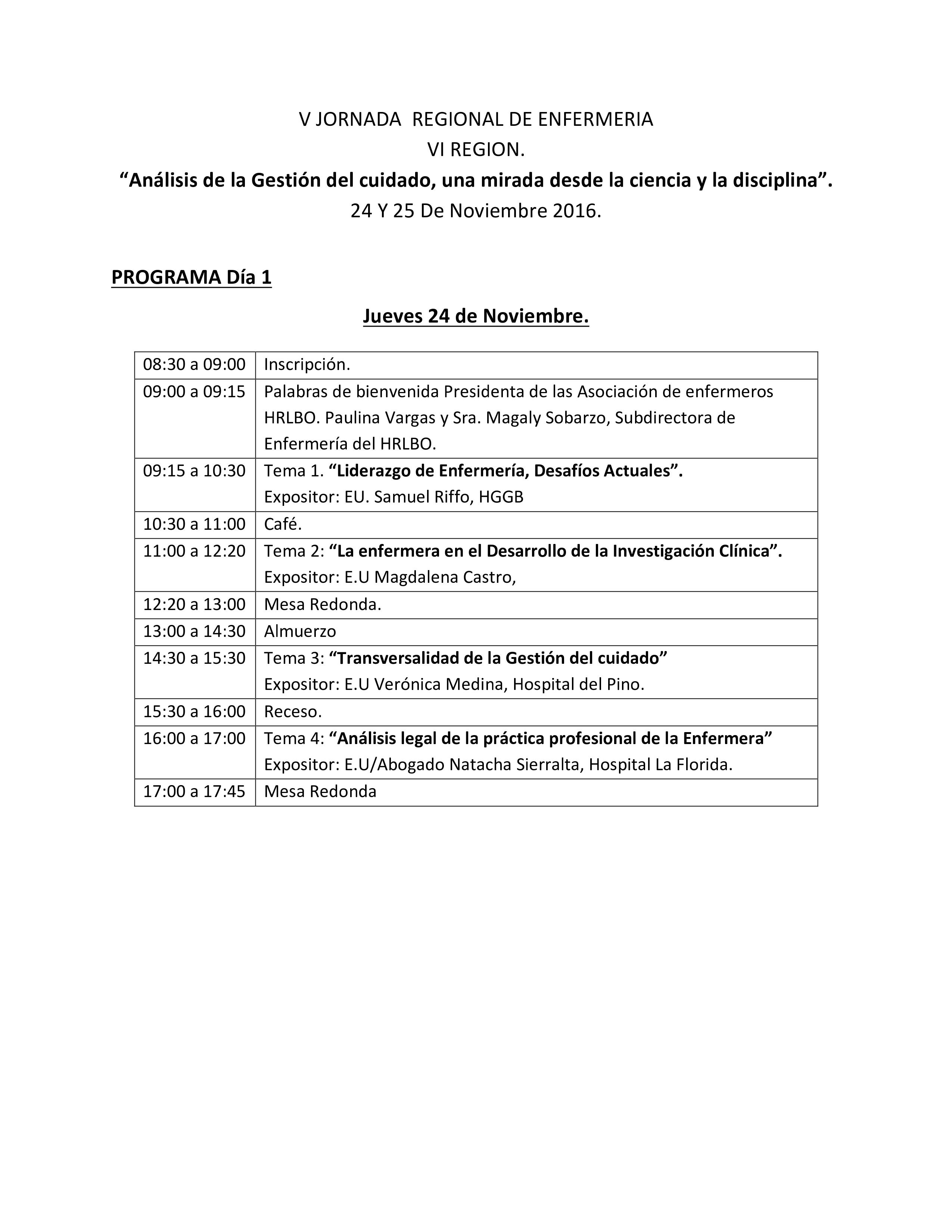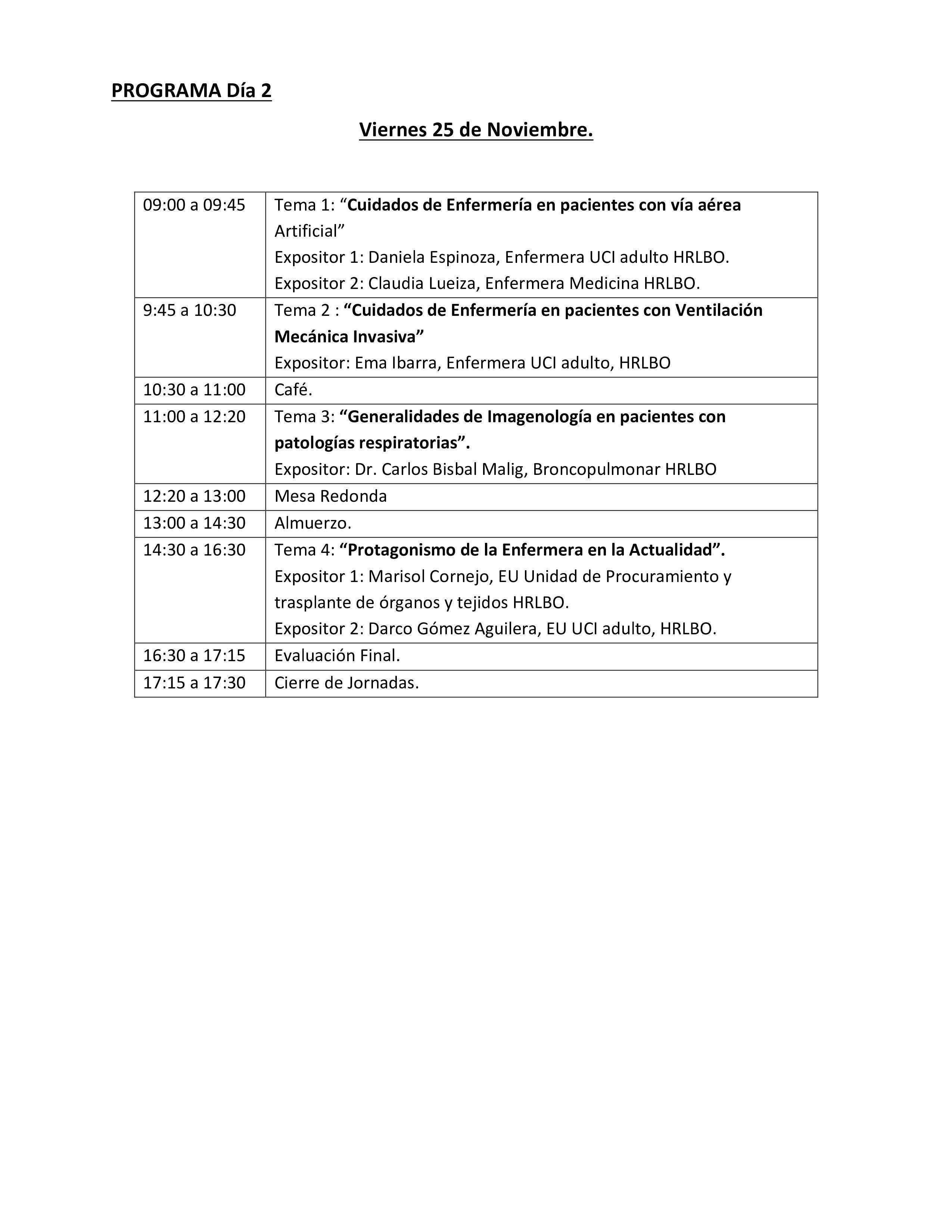 | 09:00 a 09:15 | Palabras de bienvenida Presidenta de las Asociación de enfermeros HRLBO. Paulina Vargas y Sra. Magaly Sobarzo, Subdirectora de Enfermería del HRLBO. |